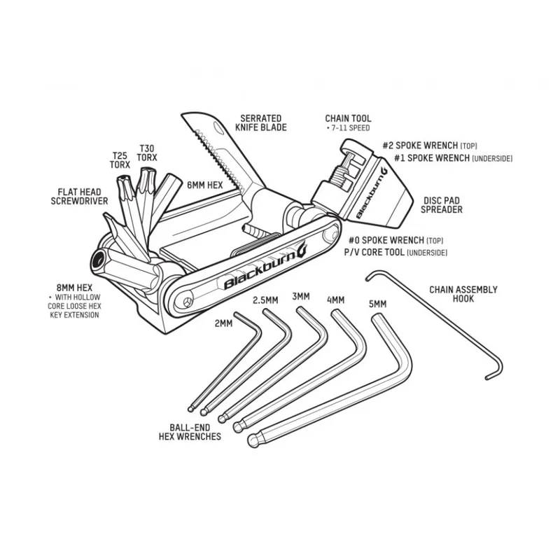 - Spoke Wrenches: Located on the chain tool handle: #0, #1 & #2 sizes