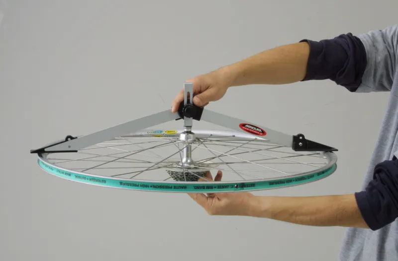 Neat compact foldable tool for ensuring wheel symmetry and correct dish after truing. Compatible with road and mountain bike wheels.